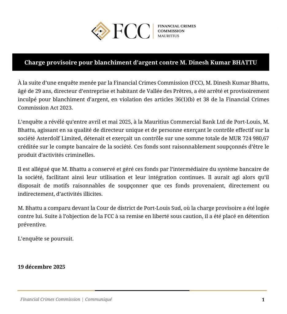 Charge provisoire pour blanchiment d’argent contre M. Dinesh Kumar BHATTU