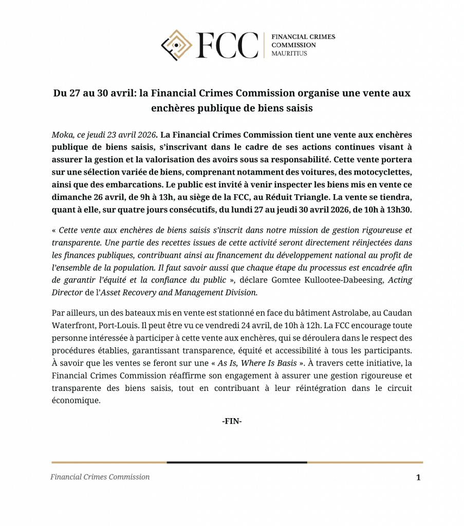 Du 27 au 30 avril: la Financial Crimes Commission organise une vente aux enchères publique de biens saisis
