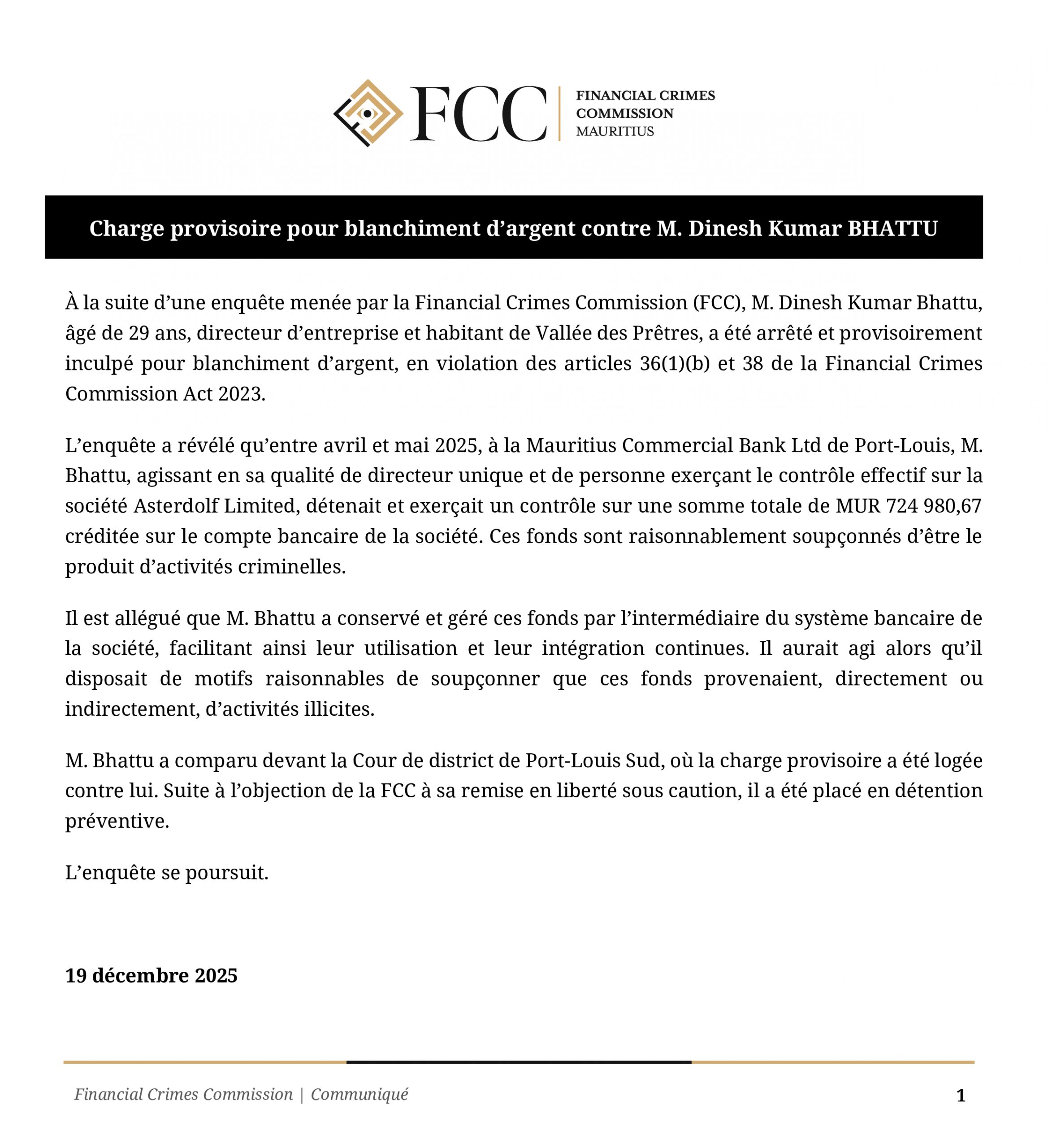 NewsBlanchiment d’argent : Le directeur M. Hajee Abdoula arrêté après une enquête de la FCC Read More