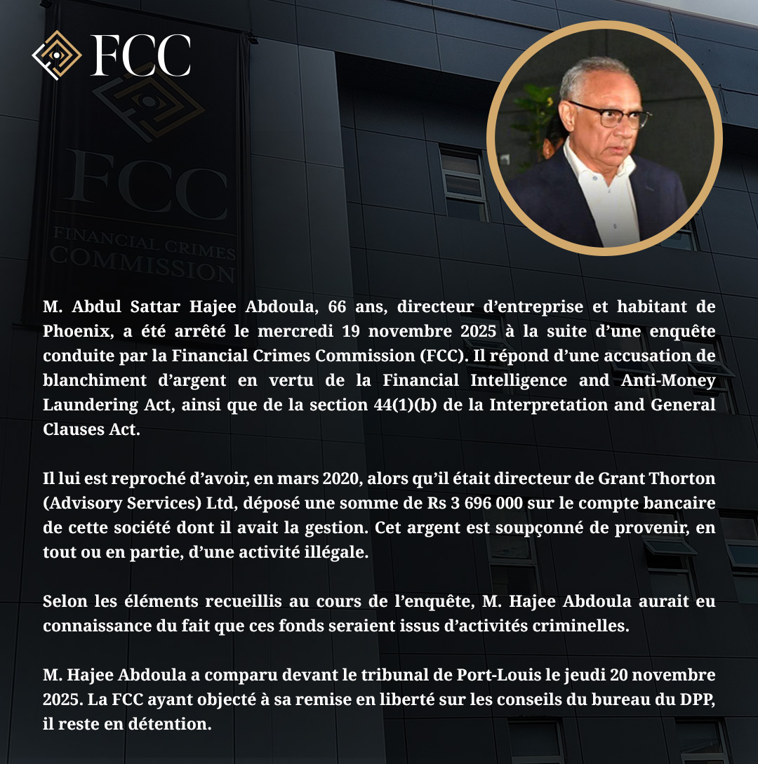 NewsBlanchiment d’argent : Le directeur M. Hajee Abdoula arrêté après une enquête de la FCC Read More